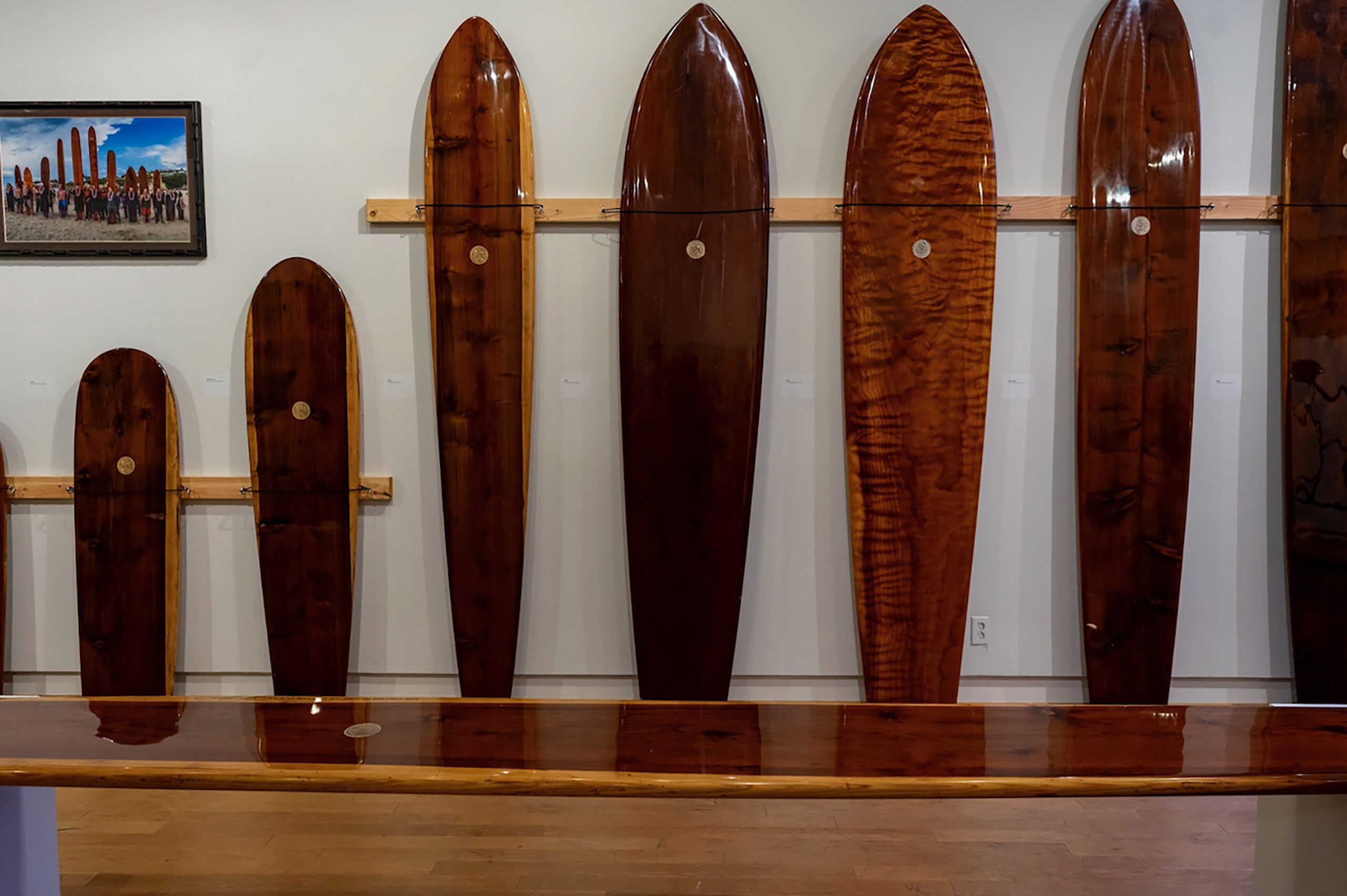 The day after the opening, they actually went out and surfed these replica boards at the mouth of the San Lorenzo River, where surfing first happened with the three Hawaiian princes. They were milled at a lumber company up the San Lorenzo River, which was the main industry in Santa Cruz at the time. These boards are massive — it takes four people to carry each one. It’s like trying to balance on a telephone pole.