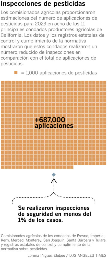 Según las estimaciones, en 2023 se fumigaron pesticidas más de 687,000 veces en los ocho condados. Ese mismo año, se realizaron 4,720 inspecciones en esos condados, lo que representa menos del 1% de las fumigaciones de campos y huertos en esas jurisdicciones, según los registros de cumplimiento presentados ante el estado.