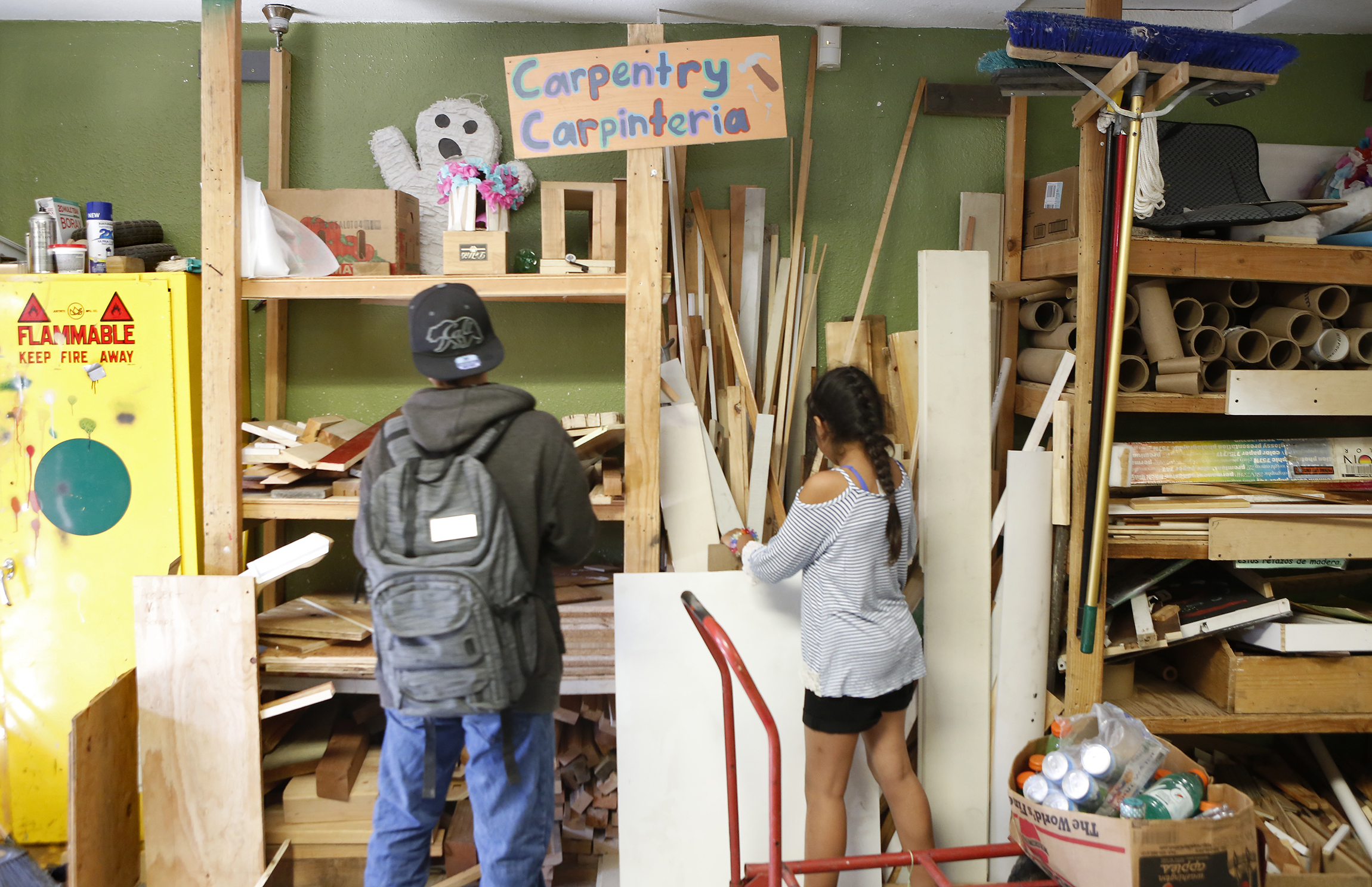 ← Previous Next → Kids gather wood for projects Inside the Environmental Science Workshop at Marinovich Park in Watsonville, California on Thursday September 6, 2018. (Photo By David Royal) Watsonville Environmental Science Workshop